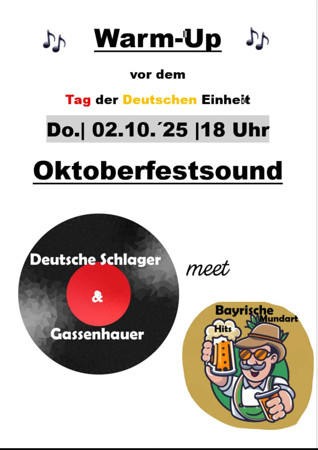 Den Abend vor dem Feiertag widmen wir den früheren Jahren der deutschen Musikgeschichte, altbekannte Schlager, Gassenhauer und bayrische Mundart bestimmen das handverlesene Musikmenü an diesem Abend und laden zum Tanzen und Mitsingen ein.